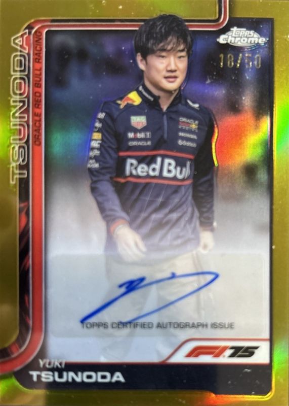 Yuki Tsunoda's Racing cards are available in at least 21 sets. Yuki Tsunoda's biggest 7-day price movers are 2020 Topps Chrome Formula 1 Sapphire Edition #60 Base, 2025 Topps Chrome Formula 1 #TG-1 The Grid /(SSP), and 2025 Topps Chrome Formula 1 #CAC-TSU Chrome Autographs - Gold Refractor /50.