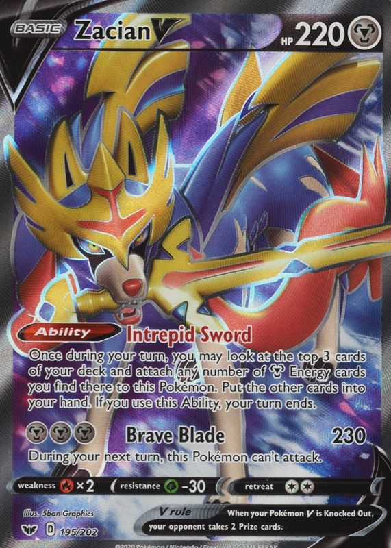 Zacian V's Pokemon cards are available in at least 6 sets. Zacian V's biggest 7-day price movers are 2023 Sword & Shield: Crown Zenith #095/159 Holo, 2020 Sword & Shield #211/202 Holo (Secret), and 2020 Sword & Shield #195/202 Holo (Full Art).