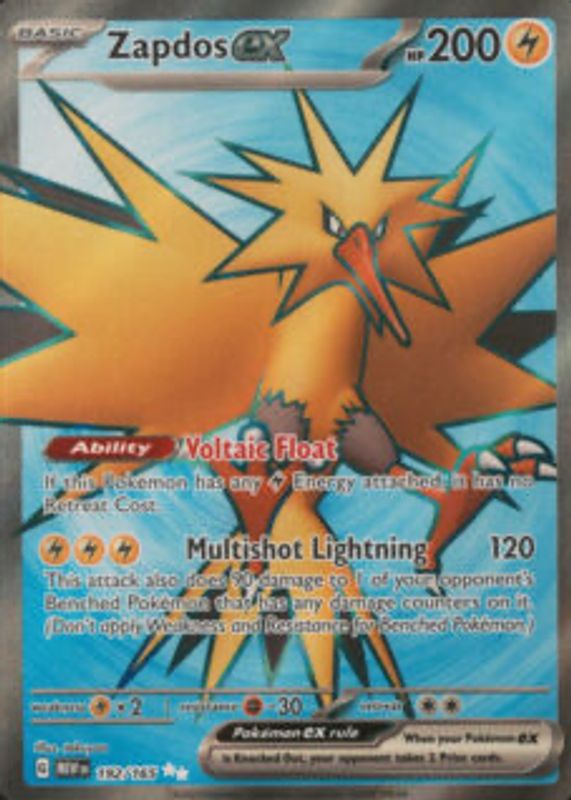 Zapdos ex's Pokemon cards are available in at least 8 sets. Zapdos ex's biggest 7-day price movers are 2023 Scarlet & Violet: Black Star Promo #SVP049 Zapdos ex Box, 2023 Japanese Scarlet & Violet: 151 #204/165 Special Art Rare, and 2023 Scarlet & Violet: 151 #192/165 Ultra Rare.