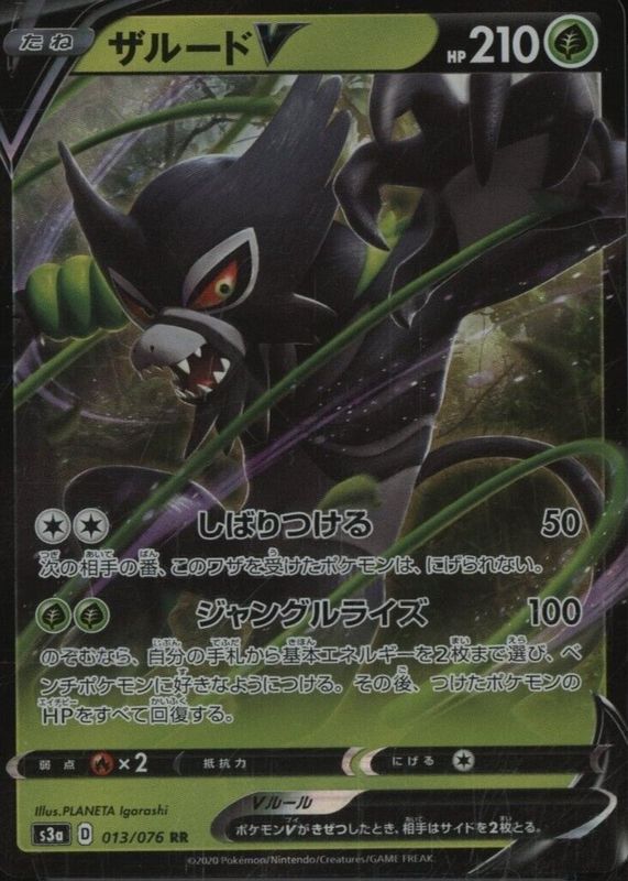 Zarude V's Pokemon cards are available in at least 3 sets. Zarude V's biggest 7-day price movers are 2020 Japanese Sword & Shield: Legendary Heartbeat #013/076 Double Rare, 2020 Japanese S-P Promo #108/S-P Otona na Garigari-kun Promotion, and 2020 Sword & Shield: Vivid Voltage #022/185 Base.