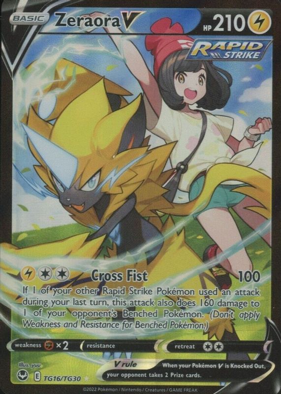 Zeraora V's Pokemon cards are available in at least 6 sets. Zeraora V's biggest 7-day price movers are 2021 Sword & Shield: Chilling Reign #165/198 Holo (Full Art), 2022 Sword & Shield: Silver Tempest #TG16/TG30 Trainer Gallery, and 2021 Sword & Shield: Chilling Reign #053/198 Holo.