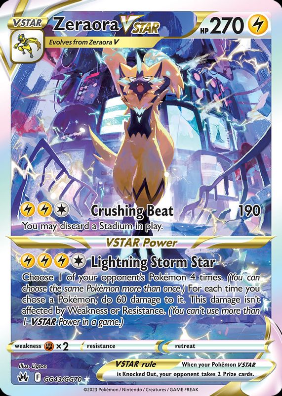 Zeraora VSTAR's Pokemon cards are available in at least 2 sets. Zeraora VSTAR's biggest 7-day price movers are 2023 Sword & Shield: Crown Zenith #055/159 Holo, 2022 Japanese Sword & Shield: VSTAR Universe #042/172 Triple Rare, and 2023 Sword & Shield: Crown Zenith #GG43/GG70 Galarian Gallery.