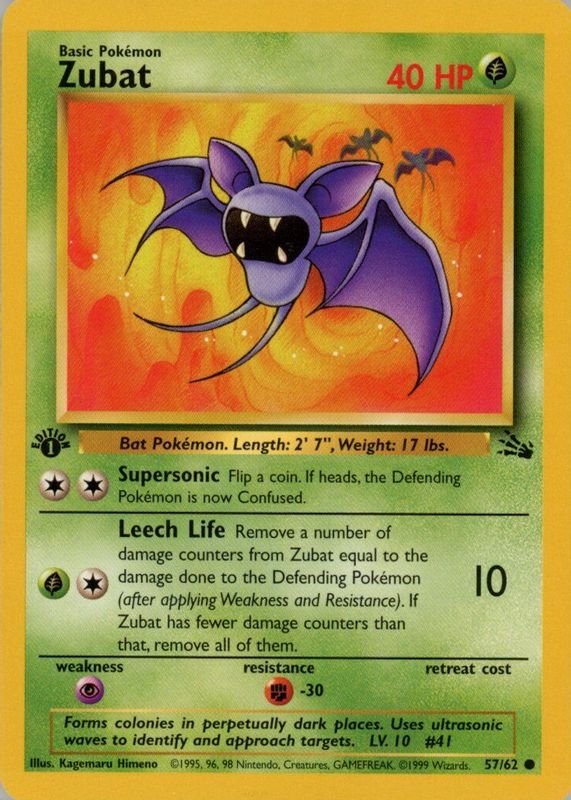 Zubat's Pokemon cards are available in at least 29 sets. Zubat's biggest 7-day price movers are 2000 Team Rocket #70/82 1st Edition, 1999 Fossil #57/62 Unlimited, and 2003 Skyridge #117/144 Reverse Holo.